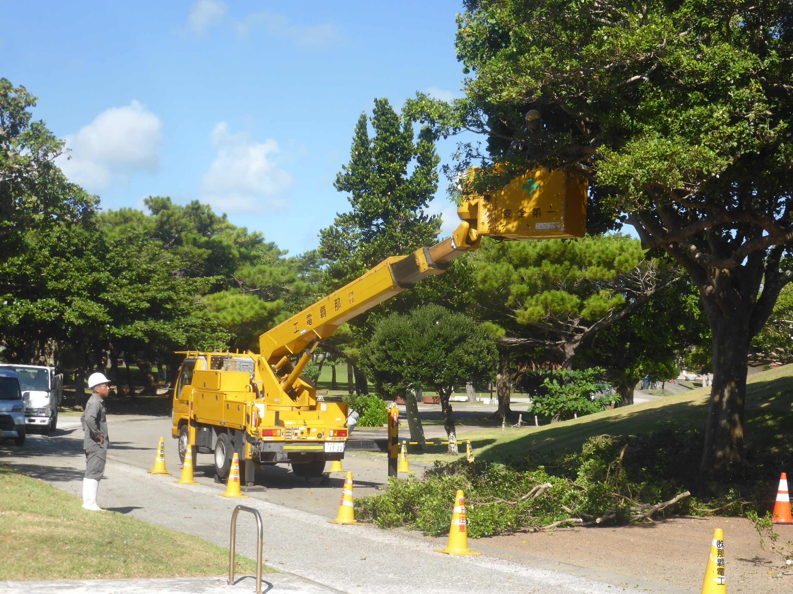 今年も熱中症に配慮し、弊社からは6名参加し、「高所作業車」による立ち木の剪定作業などに汗を流しました。