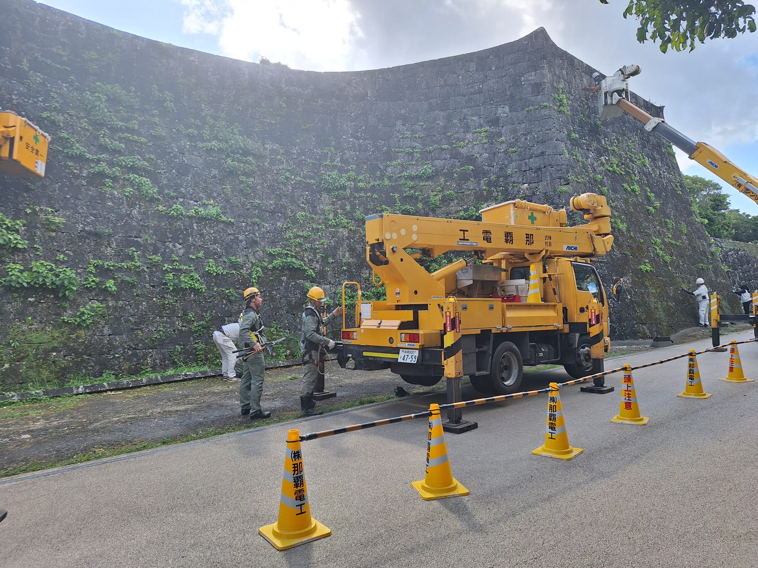 高所作業車を使って城壁等の剪定作業を行いました。
